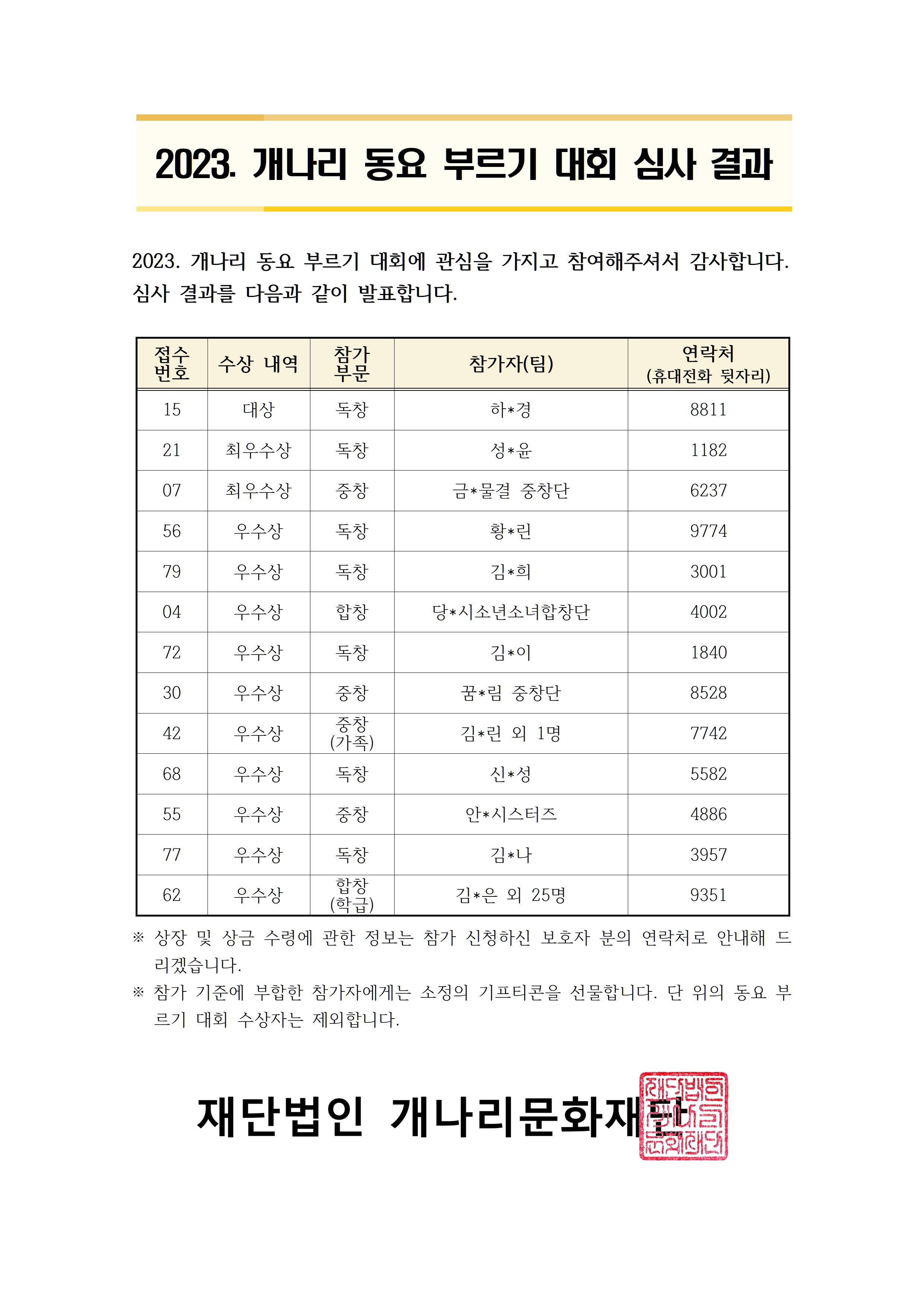 2023 개나리 동요 부르기 대회 심사결과 안내