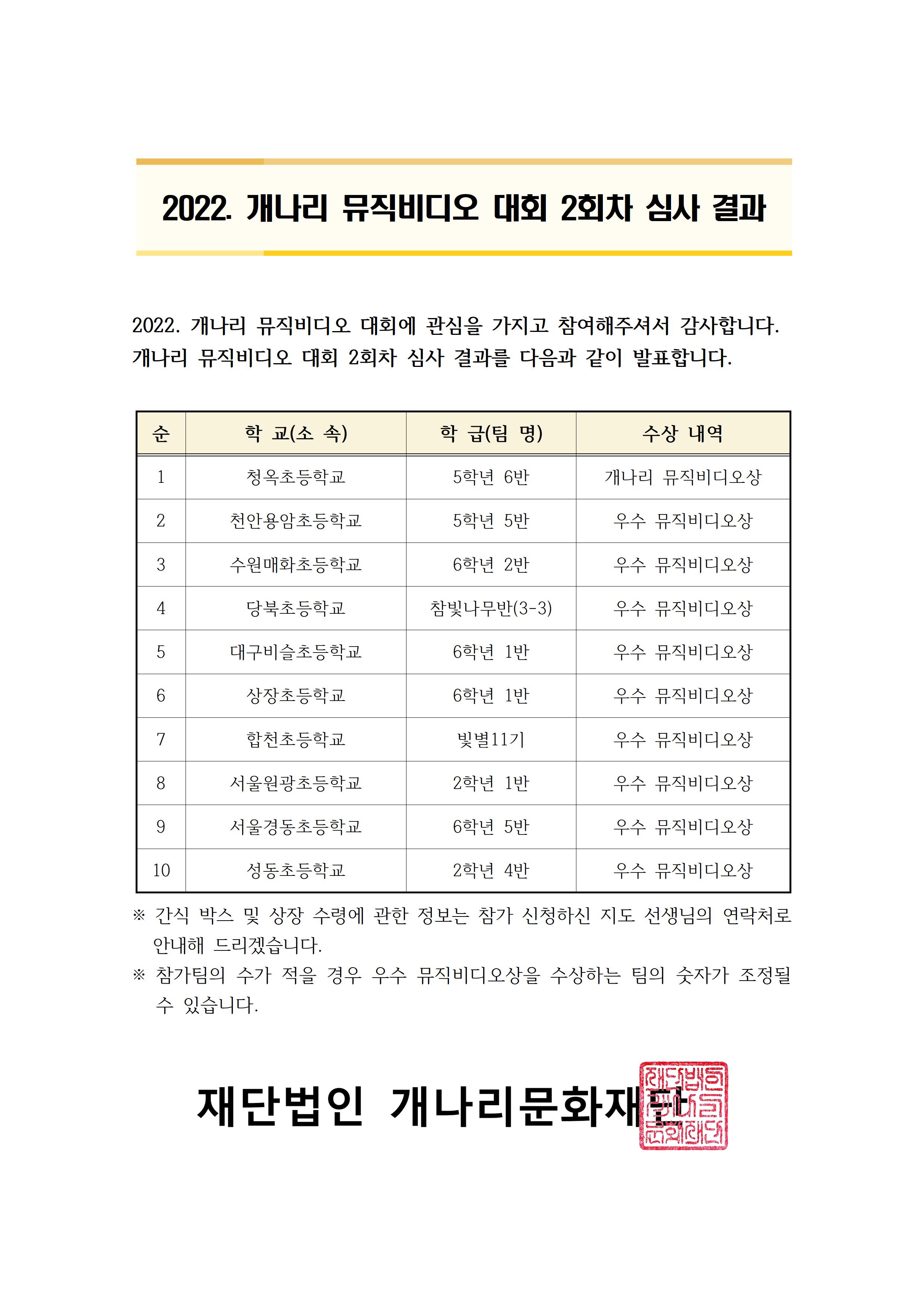 2022 개나리전국창작동요축제 뮤직비디오대회 2회차 심사 결과를 아래와 같이 안내합니다.