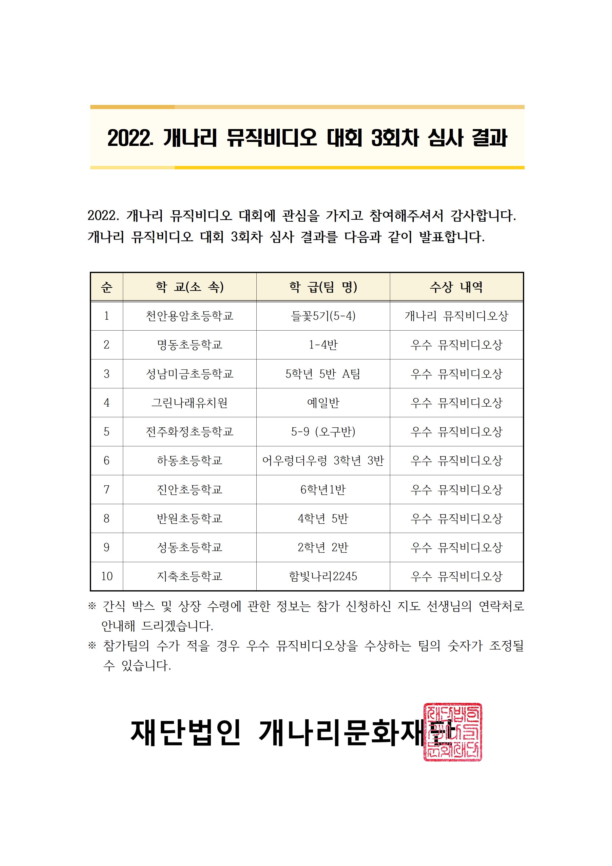 2022 개나리전국창작동요축제 뮤직비디오대회 3회차 심사 결과를 아래와 같이 안내합니다.