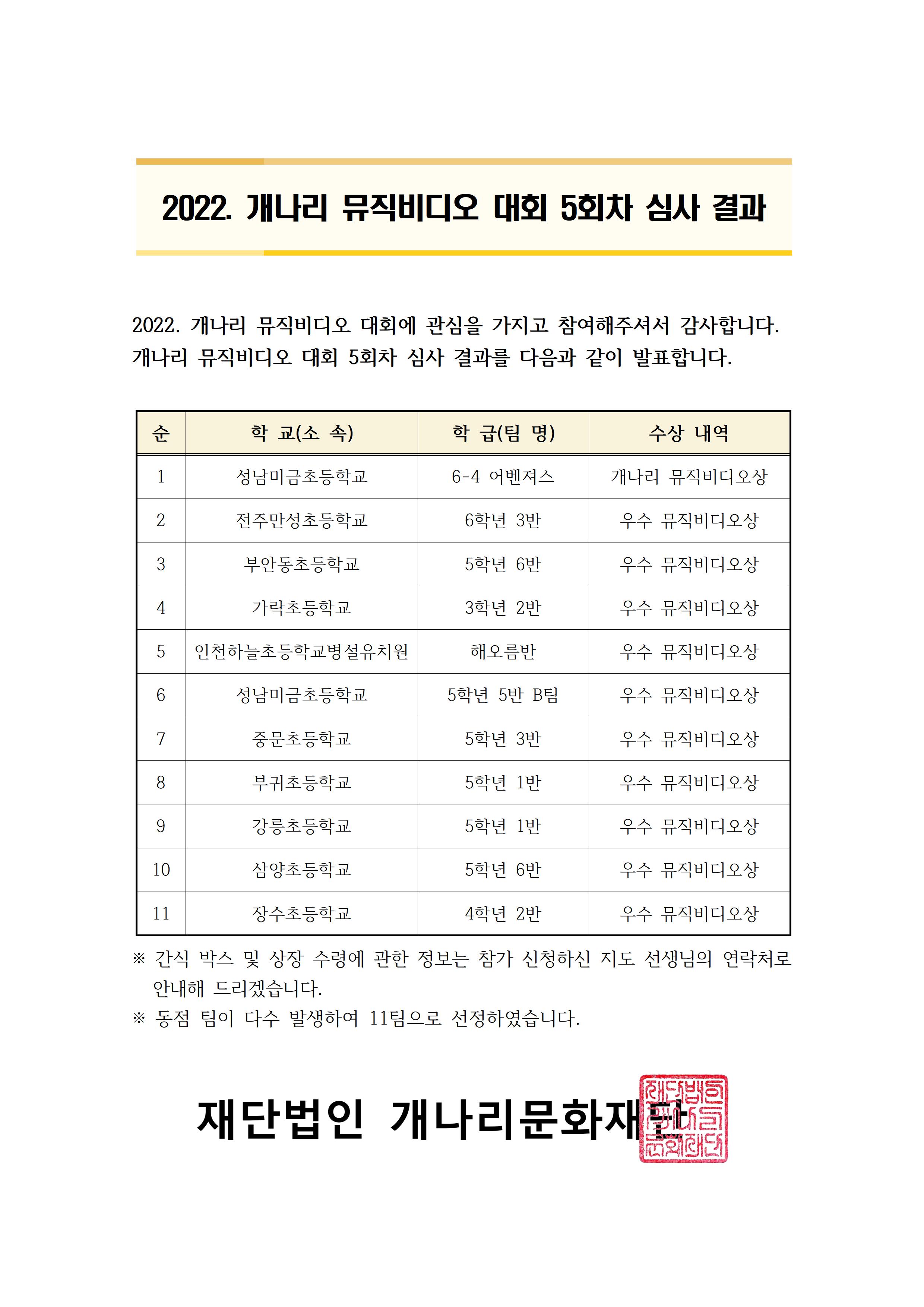 2022 개나리전국창작동요축제 뮤직비디오대회 5회차 심사 결과를 아래와 같이 안내합니다.