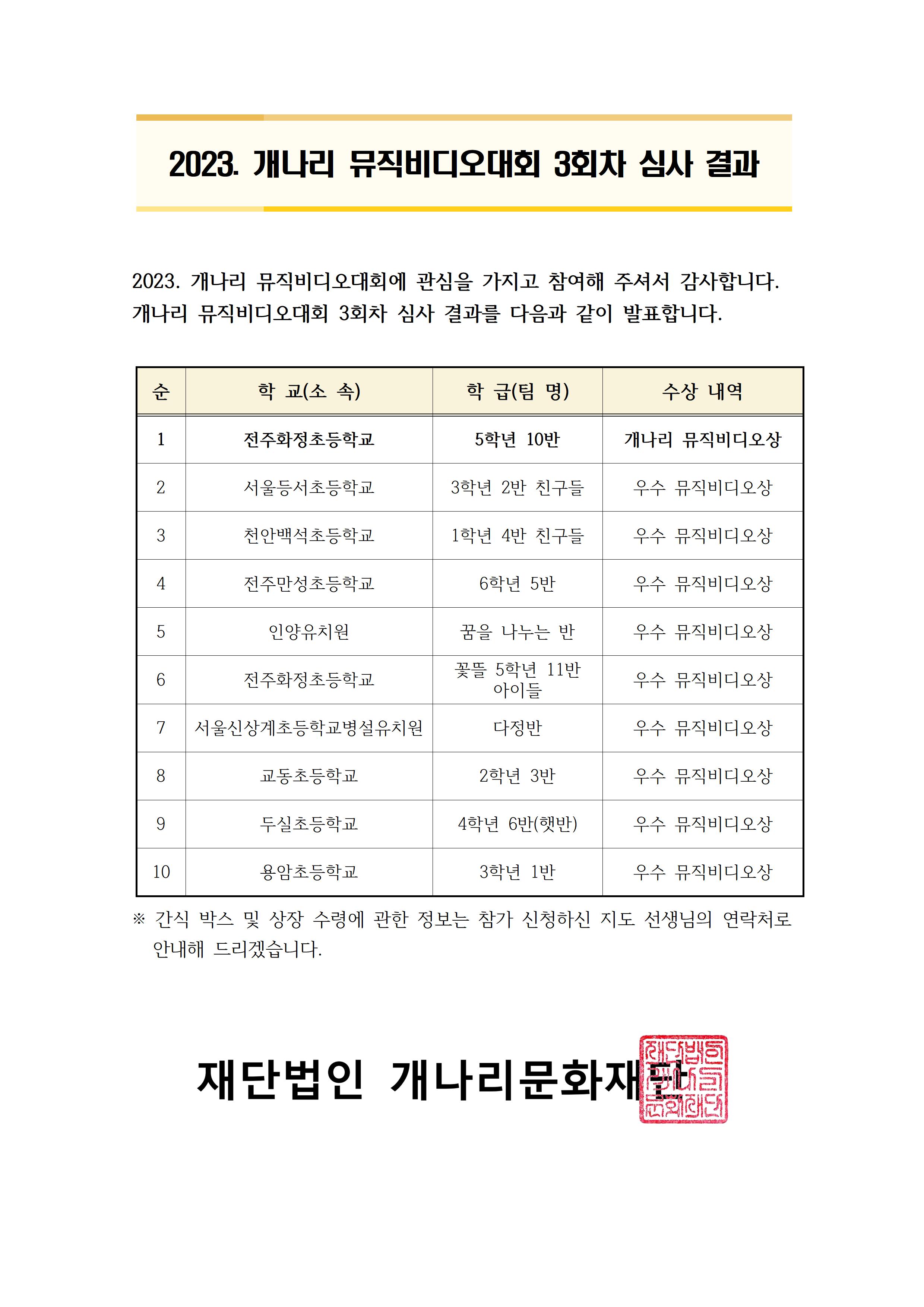 2023 개나리전국창작동요축제 뮤직비디오대회 3회차 심사 결과를 아래와 같이 안내합니다.