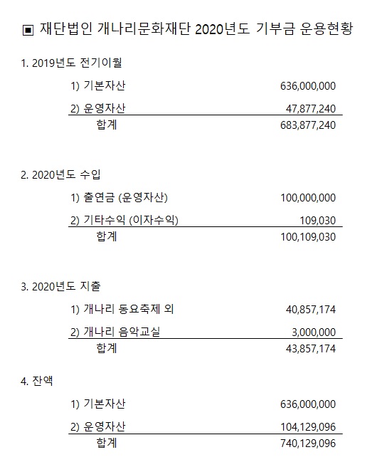 2020년 기부금 모금액 및 활용실적 명세를 아래와 같이 알려드립니다.