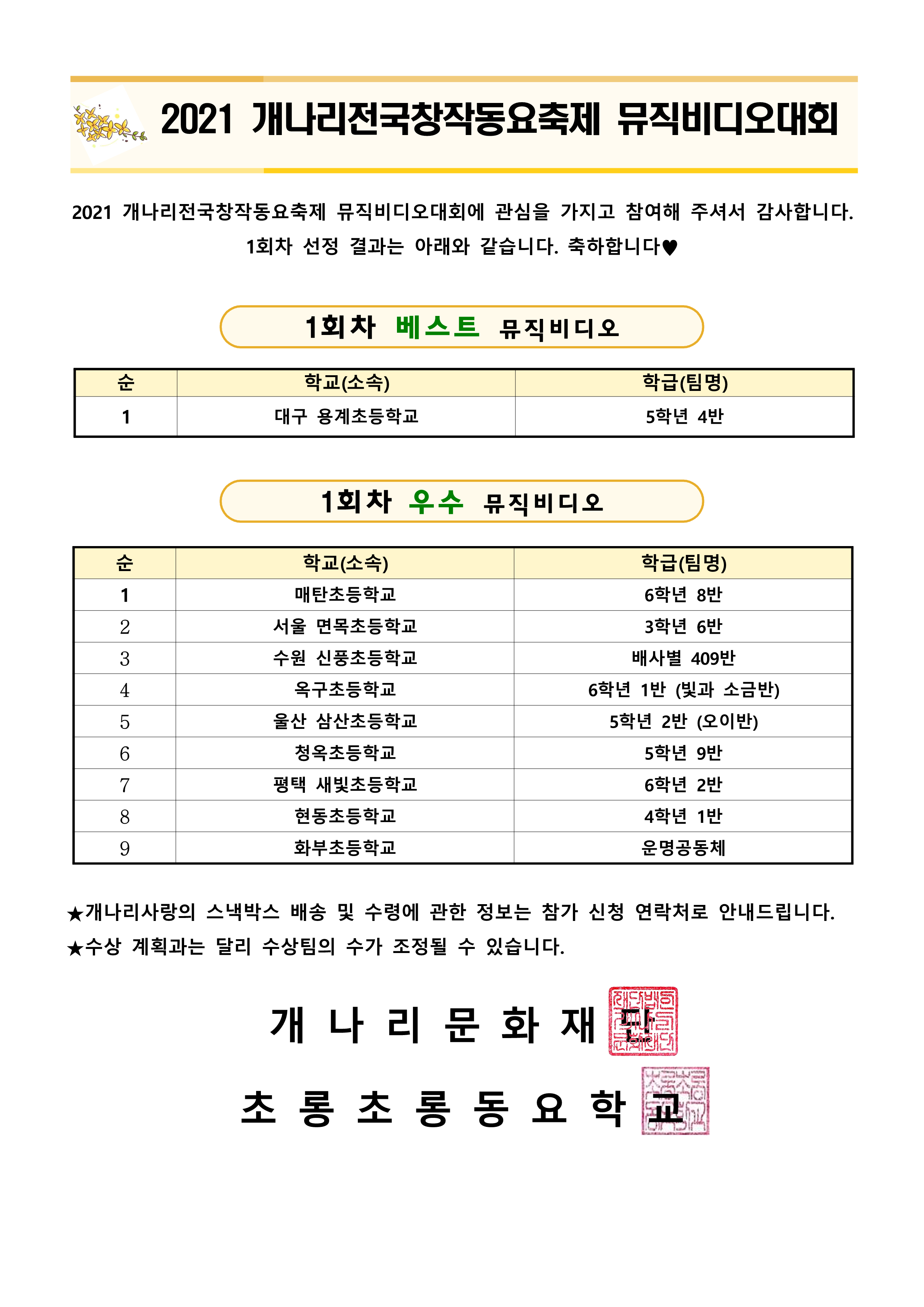 2021 개나리전국창작동요축제 [뮤직비디오대회] 1회차 심사 결과