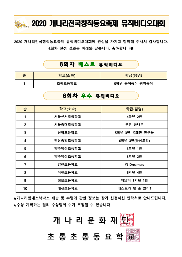 2020 개나리전국창작동요축제 [뮤직비디오대회] 6회차 심사 결과