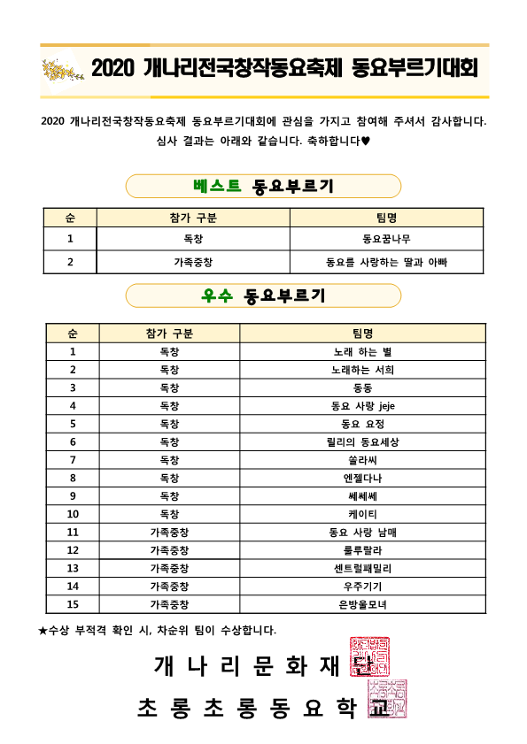 2020 개나리전국창작동요축제 동요부르기대회 심사 결과