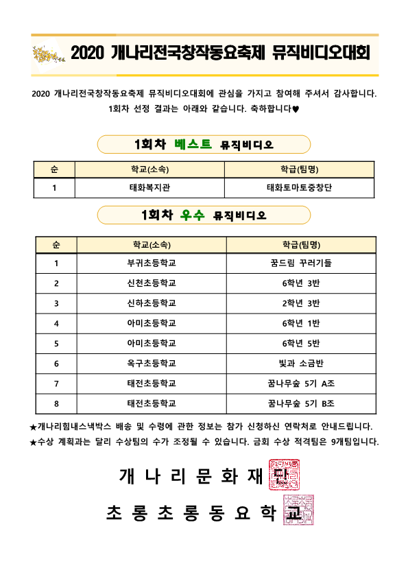 2020 개나리전국창작동요축제 [뮤직비디오대회] 1회차 심사 결과
