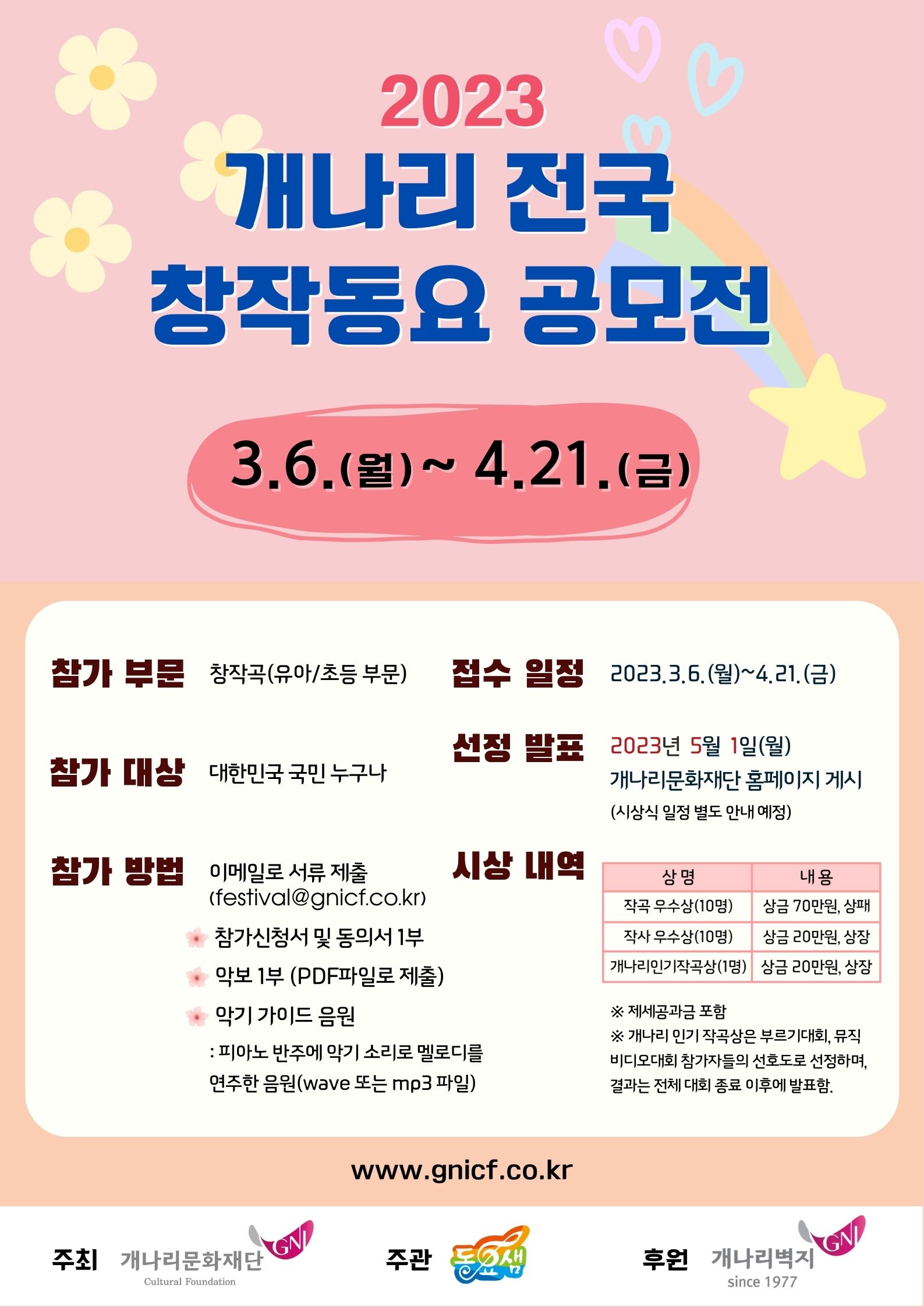 유첨된 2023년 개나리전국 창작동요 공모전 요강 및 참가신청서, 개인정보 활용 동의서를 활용하여 주시기 바랍니다.