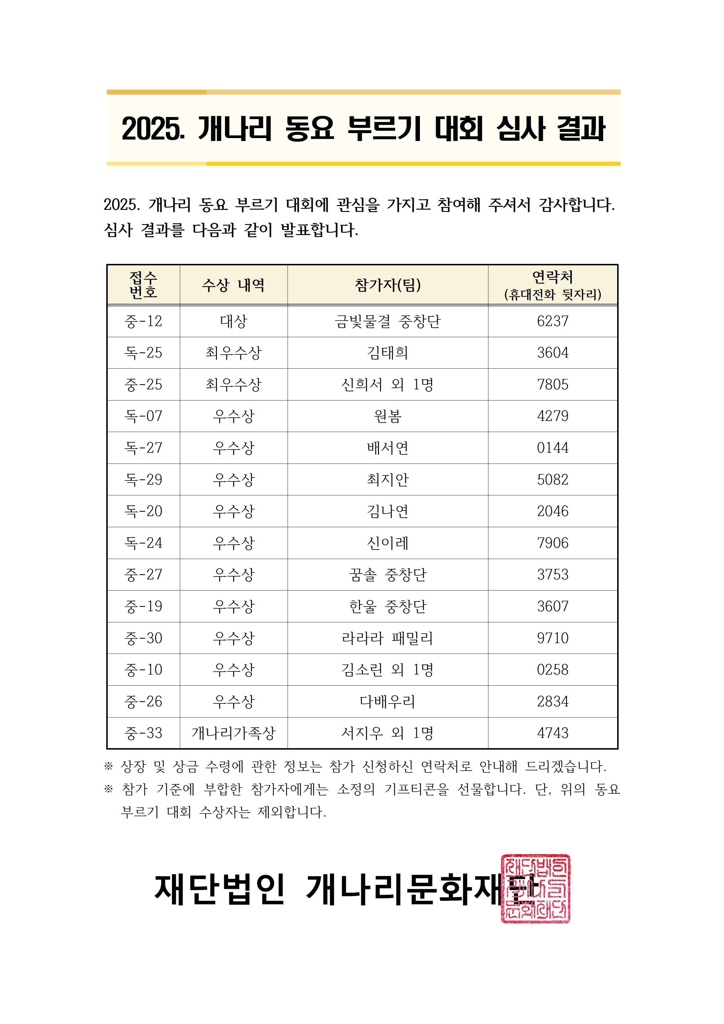 2025 개나리 동요 부르기 대회 심사결과 안내