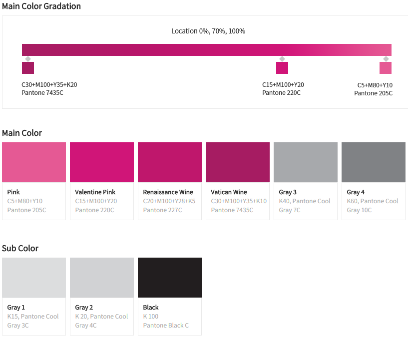 주색(Main Color)인 바티칸 와인(Vatican Wine)과 쿨그레이(Cool Gray)계열이 표준색상으로 구성되어 있습니다. 전용색상은 개나리 문화재단의 시각적 이미지의 통일을 위해 정확한 색상관리가 요구되고 있습니다.